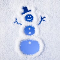 a snowman figure made out of blue items, such as marbles or stones, arranged to resemble the traditional snowman shape. The snowman is depicted with