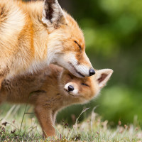 a tender moment between an adult fox and its cub. The