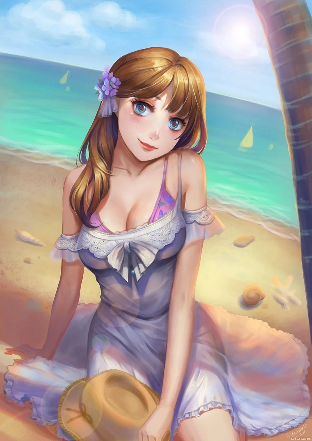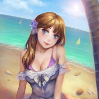 a beach scene with clear skies and the sea visible in the background. There are also elements like an umbrella and