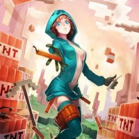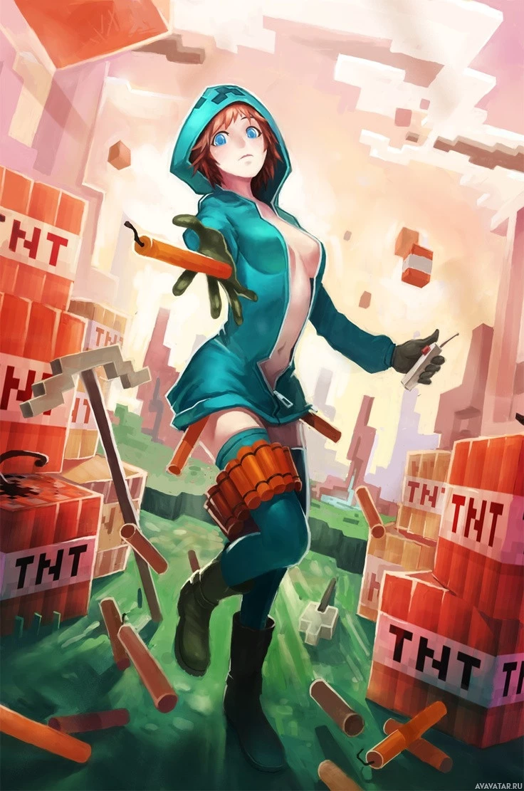 blue outfit that resembles a Minecraft creeper, which are known for their distinctive green and black coloring in the game Minecraft. In her hands, she is holding what looks like a gun and some