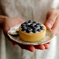The picture shows a person's hand holding a small, round pastry with blueberries on top. It appears to be a dessert or snack item. There is a plate underneath the pastry, suggesting it might be presented as part of a meal or served at a cafe or bakery.