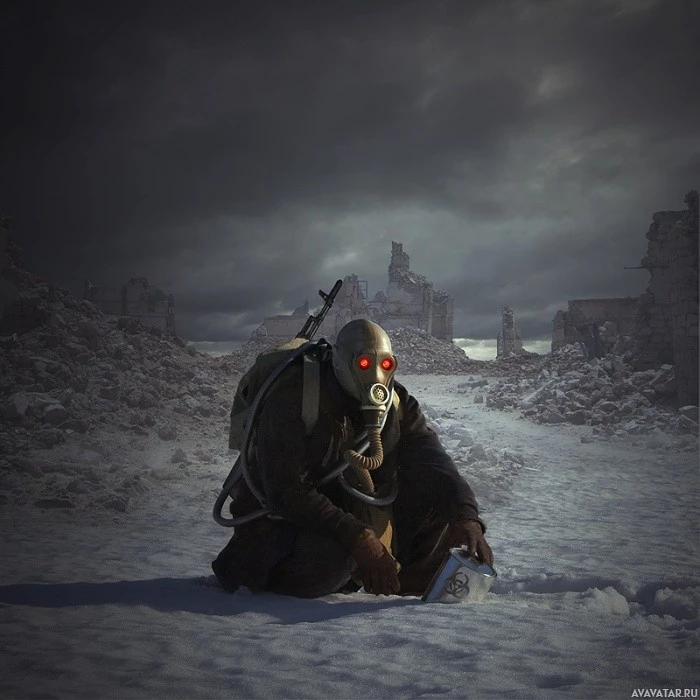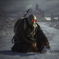 a respirator mask and have a backpack. The setting looks post-apocalyptic, with destruction and ruins around. There's snow on the ground, suggesting