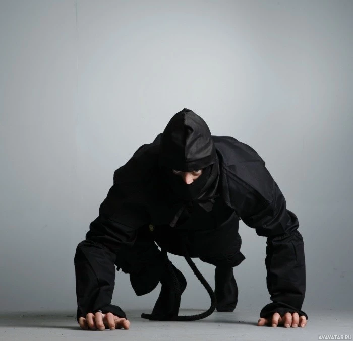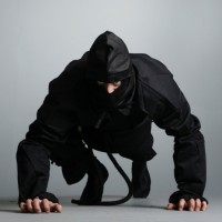 black clothing, which is often associated with ninja costumes. They appear to be crouched on the floor in a stealthy or ready-to-pounce position. The individual's attire and posture suggest they are either portraying a character from