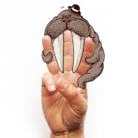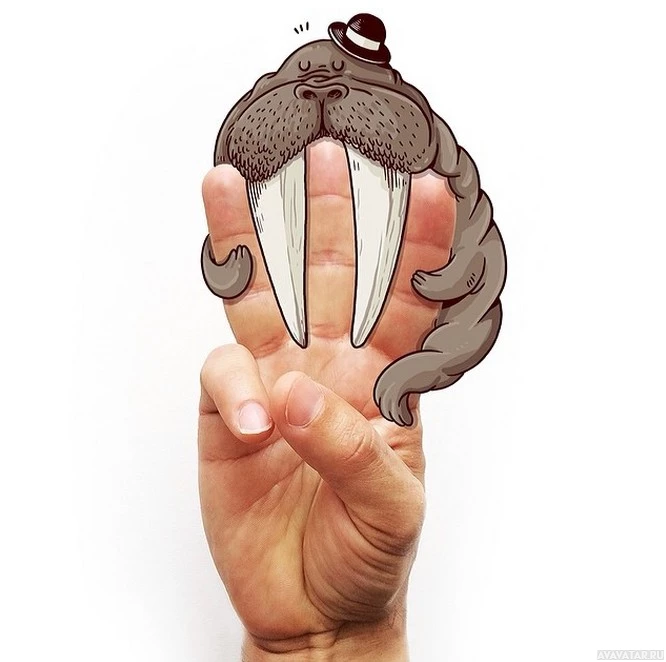 large tusks. The walrus has been anthropomorphized, giving it a face complete with eyes and a mouth, adding a humorous element to the image. The hand appears to be that of