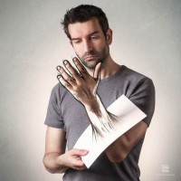 In this image, there is a man sitting with his hand on his chin. His posture suggests that he is deep in thought or contemplation. On his arm, there is