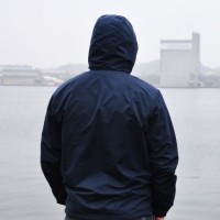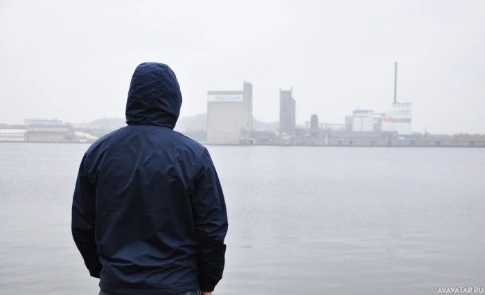 a hooded jacket or raincoat, which suggests they might be trying to stay dry from rain or snow. Behind the person, there is