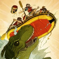 In the picture, there is a group of people inside what appears to be a boat, and they are riding on top of an animal that looks like a dinosaur. The animal is emerging from water with waves around it. The scene suggests a fantastical or whimsical adventure theme.