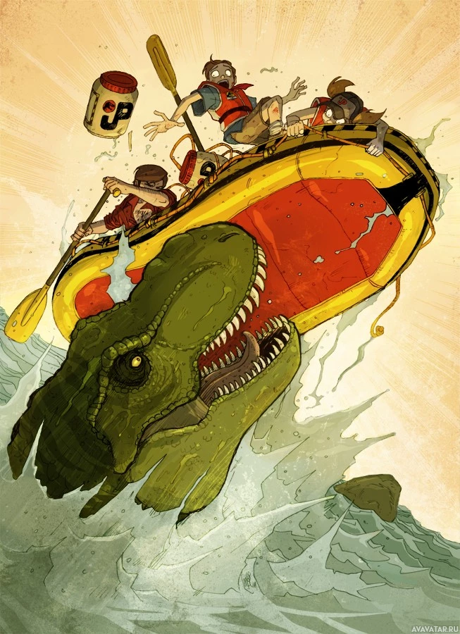 На снимке изображена группа людей внутри того, что кажется лодкой, и они едут верхом на животном, которое выглядит как динозавр. Животное выходит из воды с волнами вокруг него. Сцена предлагает фантастическую или причудливую тему приключений.