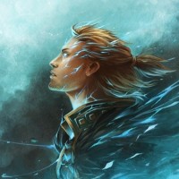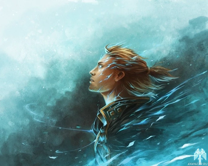 magical power or connection to mystical elements. The background is quite dramatic with swirling patterns and colors that give the impression of motion or