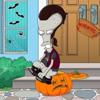 a spider web across the windows and a sign that says "WARNING: SPIDERS," along with a skull design, indicating the theme of Halloween. The character is known from an animated