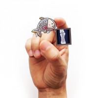 In the image, there is a hand holding a small figurine of a fish with an X-ray design on it. This could be seen as a playful or artistic representation of a fish's internal structure, possibly referencing medical imaging such as an X-ray scan.
