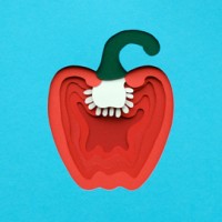 The image shows a graphic design of an illustrated pepper. It appears to be a stylized representation, with the pepper featuring a smiling face and its top is shaped like a hat or cap. This type of artwork is often used as decoration or for educational purposes related to healthy eating habits or nutrition.