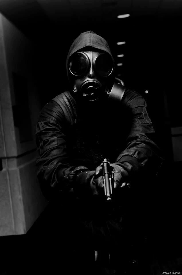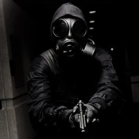 a gas mask or respirator on their face, suggesting they may be in a hazardous environment or engaged in some sort of high-risk activity. The background is dimly lit and nondescript, contributing to