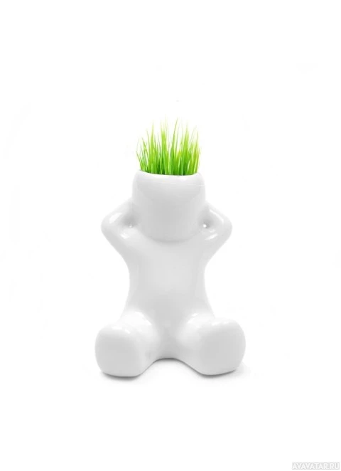 green grass, which serves as its 'hair' and adds a playful, whimsical touch to the design. It appears to be placed against