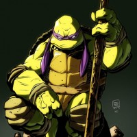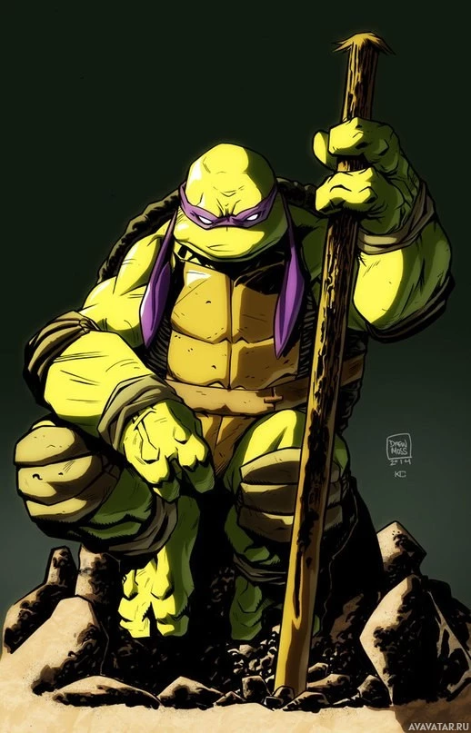 На картинке изображен Донателло, одна из черепах-ниндзя-подростков. Он изображен с серьезным выражением, приседает на скалах и держит посох горизонтально по всему телу. Донателло известен своим интеллектом и часто изображается как черепаха группы.