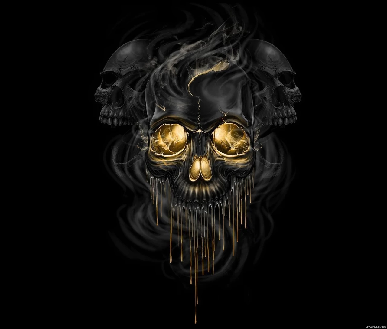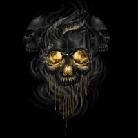 eyes of the skull are represented by what appear to be yellow diamonds or gemstones. Surrounding the skull, there is smoke or vapor ascending upwards, adding to the eerie and mystical atmosphere of the image. There is also a smear or trail leading down from the nose of the skull towards the bottom of the picture. The overall theme of the image is dark and ominous, with a focus on the intricate gold decoration contrasting against