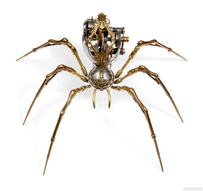 a mechanical spider-like robot with articulated legs, resembling a real spider. It has a body with an internal mechanism visible, possibly for movement or another function. The design of the robot is intricate and appears to be made with