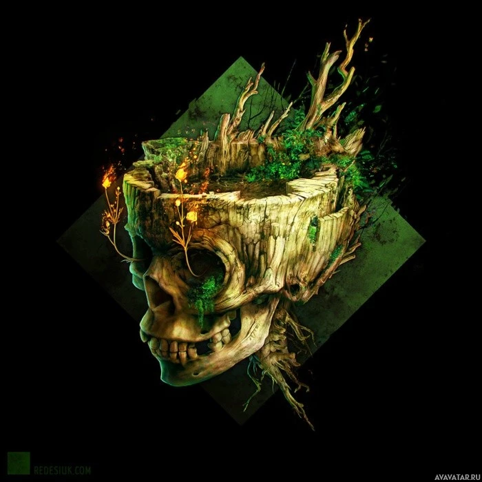 The image features a skull at the center, which is surrounded by various elements. To the left of the skull, there are