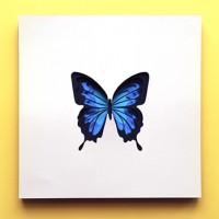 На картине изображена бабочка, которая является насекомым, а также попадает в категорию животного. Он отображается на листе бумаги или карте, который был прикреплен к поверхности с тем, что кажется лентой. Фон желтый, что обеспечивает яркий контраст с изображением бабочки.