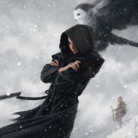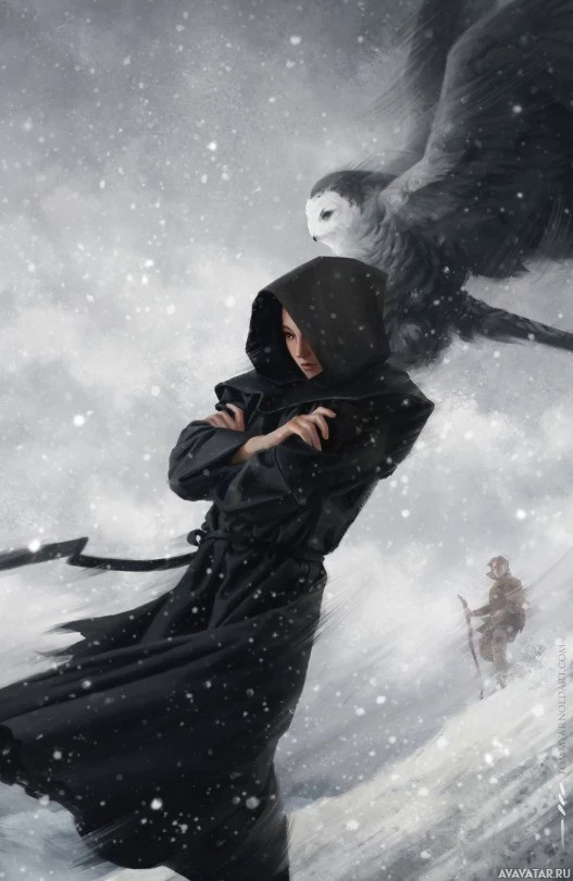 dark robes, with a hood obscuring their face. The figure is standing in the snow, surrounded by an ominous and dramatic atmosphere, possibly on a mountain or during a snowstorm. There's