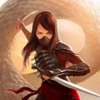 an action pose, holding two swords crossed in front of her body. Her attire includes what looks like armor with metallic details, and she seems to be set against a backdrop that suggests an outdoor, possibly desert-like environment during sunset or sunrise, given