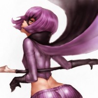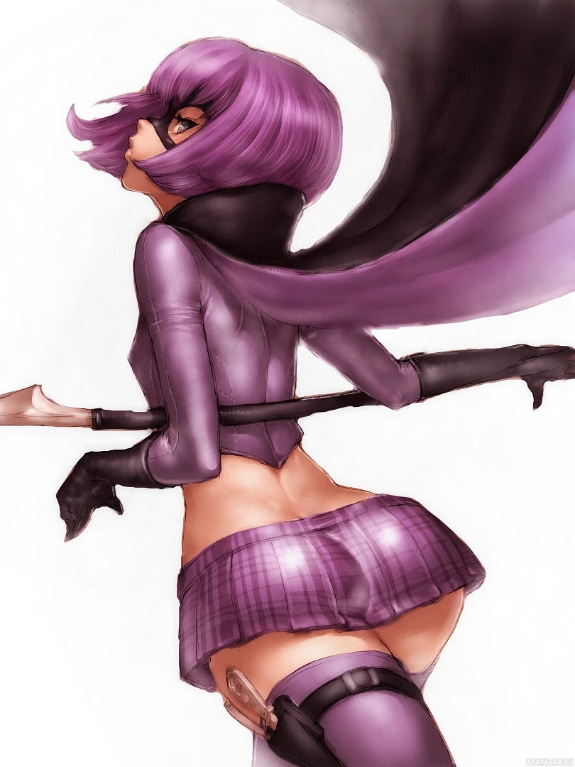 a female character who appears to be inspired by the comic book character Hit-Girl. She is shown from behind and is wearing
