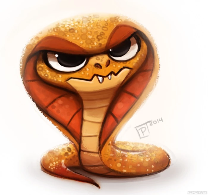 На картине изображена иллюстрация змеи. Он, кажется, нарисован в причудливом или мультяшном стиле, с преувеличенными чертами, такими как большие глаза и хмурое выражение. Змея окрашена в желтый цвет с красными деталями и имеет узорчатое тело, которое предполагает чешуйки.