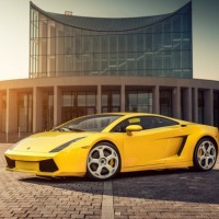 На картинке изображен желтый спортивный автомобиль Lamborghini, припаркованный перед архитектурным зданием с изогнутым стеклом. Солнце кажется низким на горизонте, предполагая, что это рано утром или поздно вечером.
