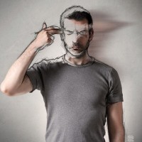 deep thought or contemplation, as he is holding his hand to his head and looking downwards with a somewhat troubled expression. There's also a pencil behind him, suggesting he might have been sketching or doodling. The style of the image has