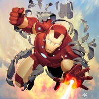 energy beams from the arc reactor powering his suit. Iron Man appears to be on a mission or engaged in combat, as suggested by
