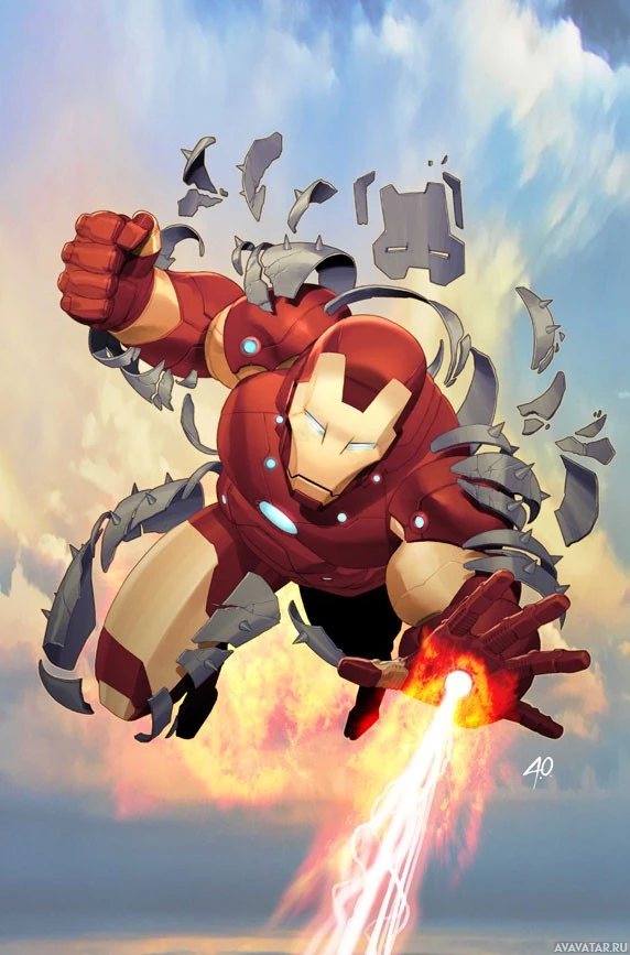 Iron Man, a popular comic book superhero, in mid-flight. He is firing a blast from his chest armor, which is typical of his character's ability to generate and project
