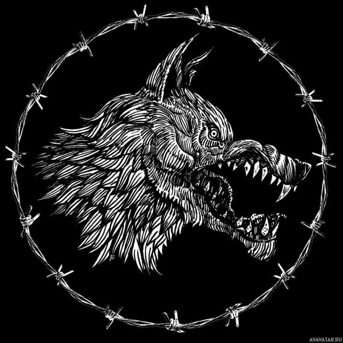 the fur texture, eye, nose, teeth, and ears. The background is dark, which makes the wolf stand out prominently. There is also a circular border composed of barbed wire elements that adds to the overall
