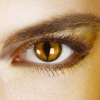 The image shows a close-up of two human eyes with makeup. One eye is wearing black eyeliner, and the other has gold eyeliner. Both eyes are accentuated with false eyelashes that appear to be a bit longer on the right side than the left. The makeup gives a striking contrast between the two eyes.