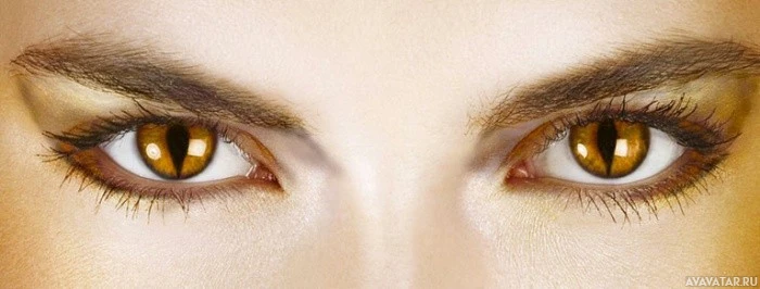 Картинка показывает крупный план из двух человеческих глаз с макияжем. Один глаз носит черную подводку, а другой имеет золотую подводку. Оба глаза акцентированы ложными ресницами, которые кажутся немного длиннее с правой стороны, чем с левой. Макияж дает разительный контраст между двумя глазами.