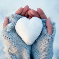 a flat surface that has been covered with snow and then quickly releasing the pressure, leaving a heart-shaped indentation in the snow. The hands are wearing winter gloves or mittens, suggesting cold