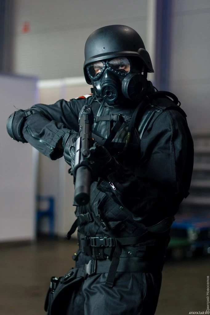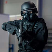 protective gear, including a gas mask, helmet, and body armor. They are holding what appears to be a firearm with both hands, pointed towards the camera at an angle. The setting seems to be an industrial or warehouse-like environment.