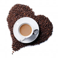 The image shows a cup of coffee with cream, placed on a saucer next to a heart-shaped arrangement of whole coffee beans. The background is plain and white, highlighting the objects in focus.