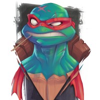 The image shows a drawing of Raphael, one of the Teenage Mutant Ninja Turtles. He is depicted with his characteristic green skin and red bandana, wearing his signature mask that covers his eyes. He also has two swords strapped to his back.