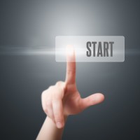 The image features a person's finger pointing to a digital button on a screen with the word "START" in