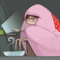 a domestic interior; there's a sink with soap dispensers and dishes on it, indicating that this scene is taking place in a kitchen or bathroom area of a home. There are items such as a bowl and a cup visible in the foreground. The character is also using a laptop, which could imply they are trying to work or attend to some task despite their discomfort. The overall tone of the image is quite somber, with
