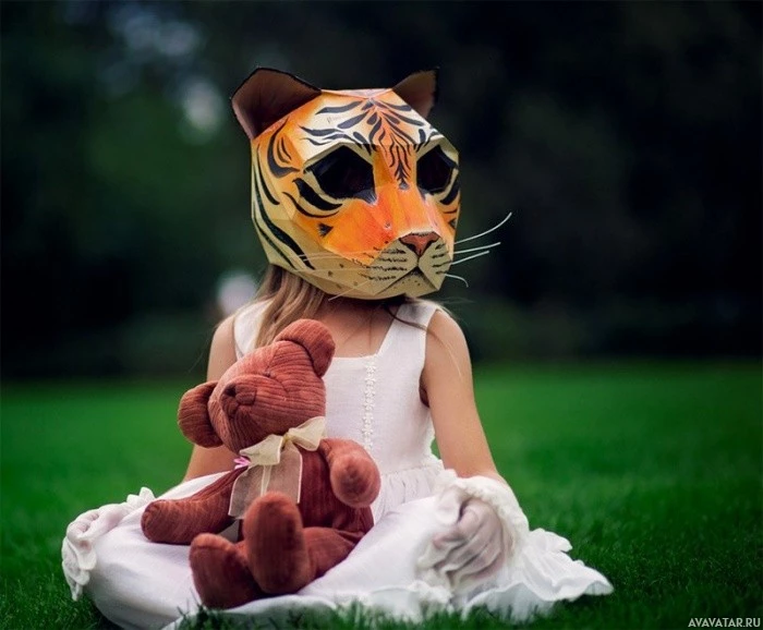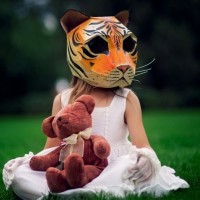 a tiger mask that covers their face. They are holding what appears to be