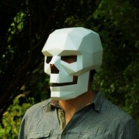The image shows a person wearing a mask that resembles a skull. The mask appears to be made from white 3D-printed or molded material, giving it an intricate and detailed appearance. The person is standing in what seems to be a natural