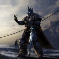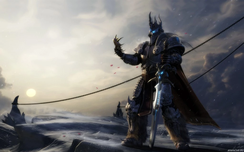 a character from the game "World of Warcraft," known as the Lich King, standing on what appears to be a frozen ocean or an icy shore. He is holding a staff with one hand and is dressed in armor that includes a cape. In the background, there are silhouettes of structures that could be part of