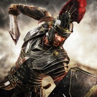 The image features a male character dressed in what appears to be ancient Roman armor. He is holding a sword and has a determined expression on his face, as if he's ready for battle or preparing to strike. The background suggests a dramatic scene with dark clouds and lightning, which adds to the intensity of the image.