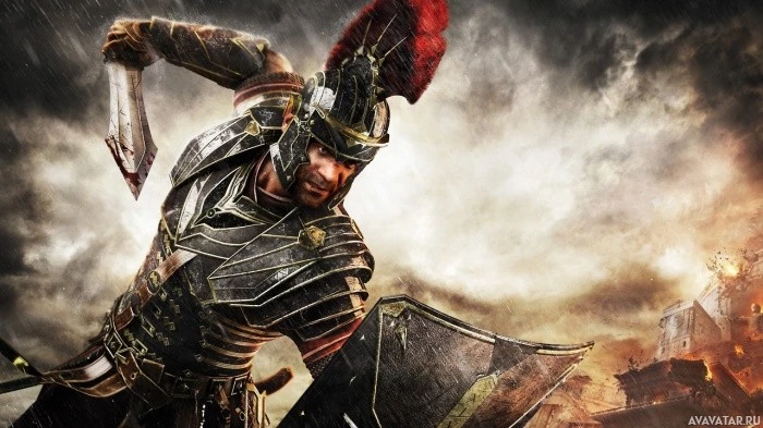 На картинке изображен мужской персонаж, одетый в древнеримские доспехи. Он держит меч и имеет решительное выражение лица, как будто готов к бою или готовится нанести удар. Фон предполагает драматическую сцену с темными облаками и молниями, что добавляет интенсивности изображению.