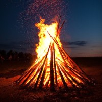 The picture shows a bonfire with flames consuming wood. It appears to be twilight or early evening, as the sky is dark and the fire's glow is prominent. There are no visible people around the bonfire in this particular frame of the image.