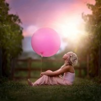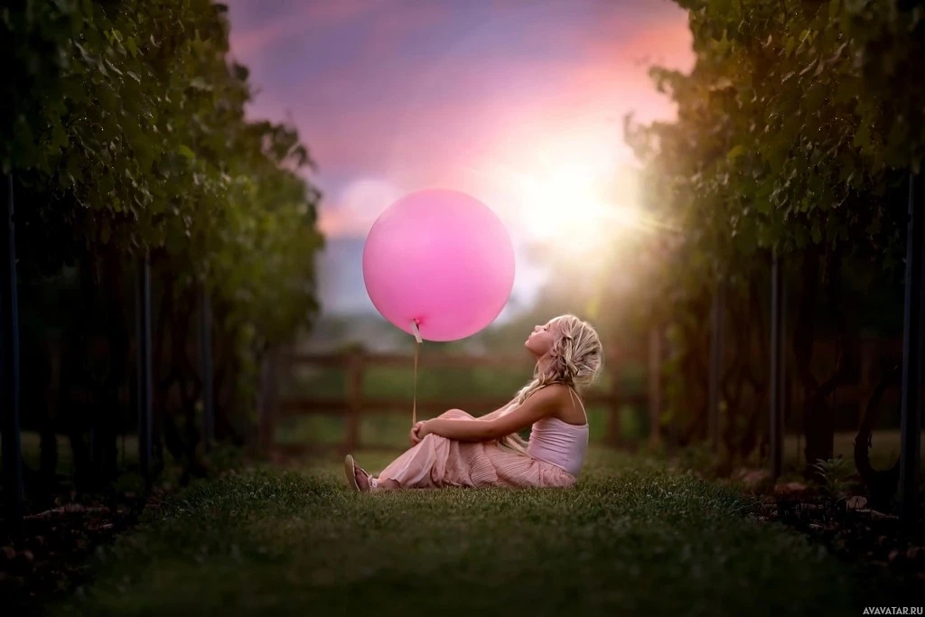 a pink balloon. They appear to be looking up at the sky, possibly watching the sunset or stars through what looks like a vineyard, given the presence of grapevines in the background. The lighting suggests it could be twilight.