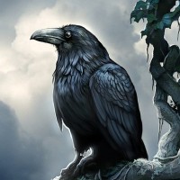 The image features a majestic bird, likely a raven or crow, perched on the edge of