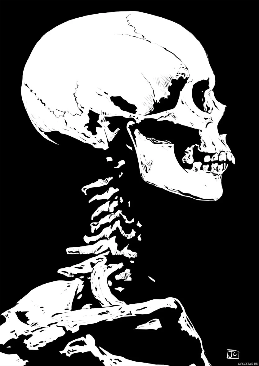 На картинке показана стилизованная иллюстрация человеческого скелета в профиль. Это простой черно-белый дизайн, который имеет череп и кости верхней части тела, включая грудной клетки и лопатки.