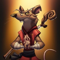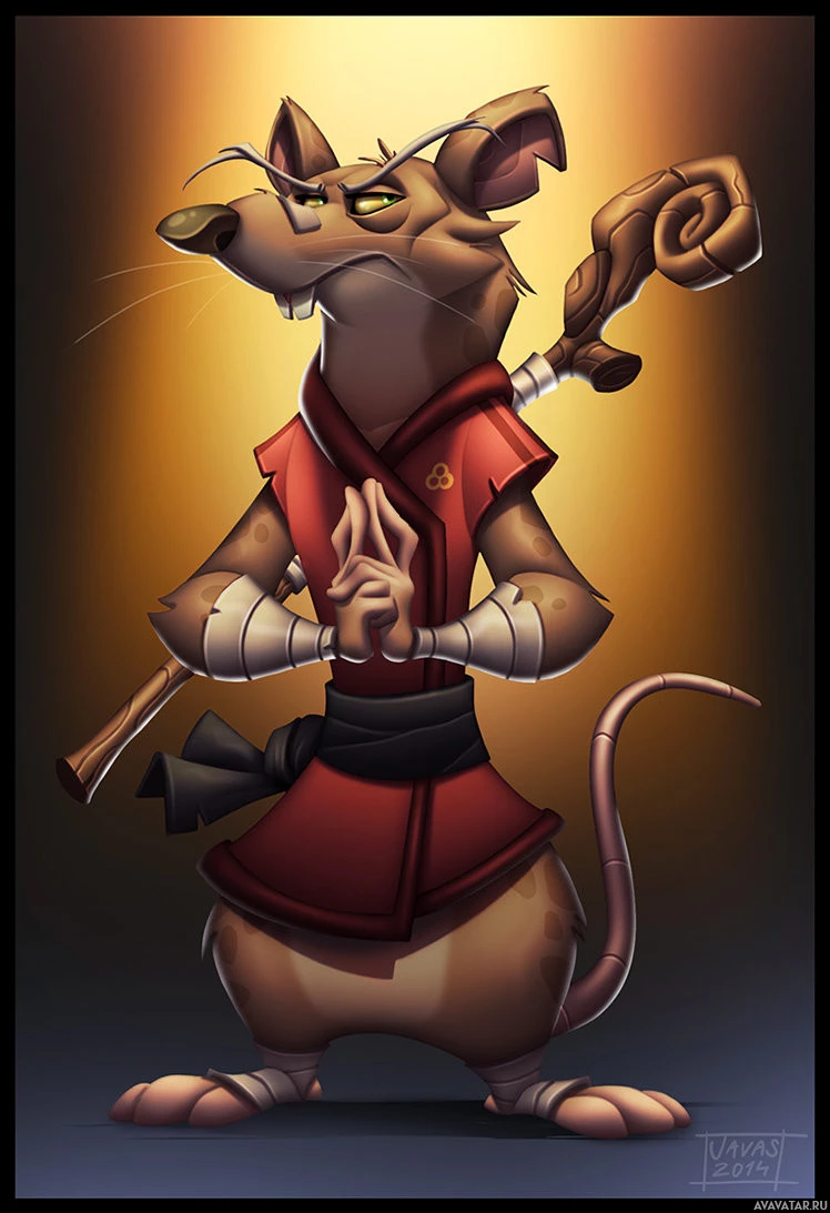 an animated character that appears to be a rat dressed in martial arts attire, complete with a sash and holding a scroll. This character is depicted as a warrior or possibly a ninja, given the style of clothing and the weapon it holds. The character's stance and expression suggest they are confident or meditative in nature. There is no specific reference to Splinter from the Teenage